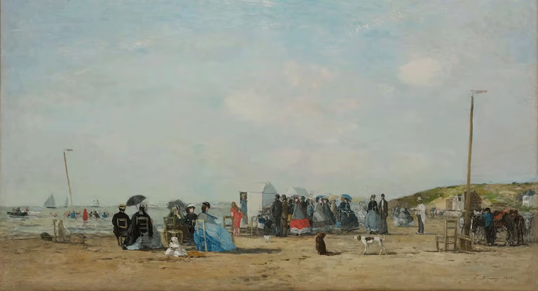 Decir que Boudin pintaba “playas” es no hacerle justicia (“Aunque haga otras cosas, siempre seré el pintor de las playas”, ironizaba a propósito de que fueron esas pinturas las que le valieron ganarse un nicho en el mercado de su tiempo). En sus mejores obras, el elemento dominante no son la arena ni las figuras humanas, sino la atmósfera: el modo en que la luz atraviesa la bruma, o cómo el mar se corresponde con el cielo; las franjas de color que se forman en los horizontes y los efectos de las sombras proyectadas.
