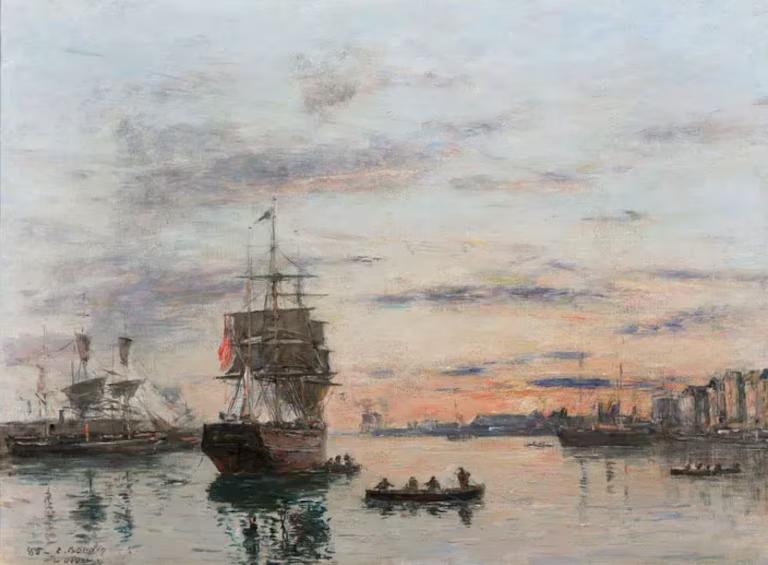 Ese taller de marcos era, al mismo tiempo, una especie de academia popular: artistas como el retratista Jean-Baptiste Isabey o Jean-François Millet (de la Escuela de Barbizon) pasaban por allí, y el joven Boudin comenzó a observar, a copiar y, de esa manera, a practicar el oficio. Años más tarde, en París pero también en su regreso a Normandía, desarrolló una rutina de salidas al aire libre que sería decisiva para su carrera y también un legado: pequeños estudios hechos sobre lienzo o sobre papel, que habitualmente eran terminados en el taller.