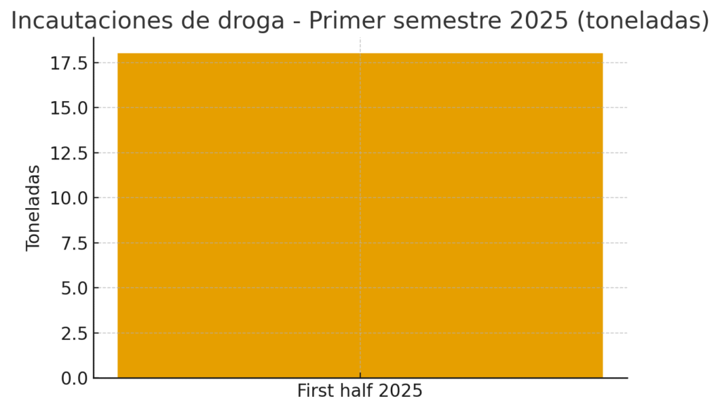 Incautaciones de droga — tonaje reportado en el primer semestre de 2025 (≈ 18 toneladas, según declaraciones oficiales y reportes de junio 2025). Fuentes: Ministerio de Defensa. Contexto global: UNODC World Drug Report 2025