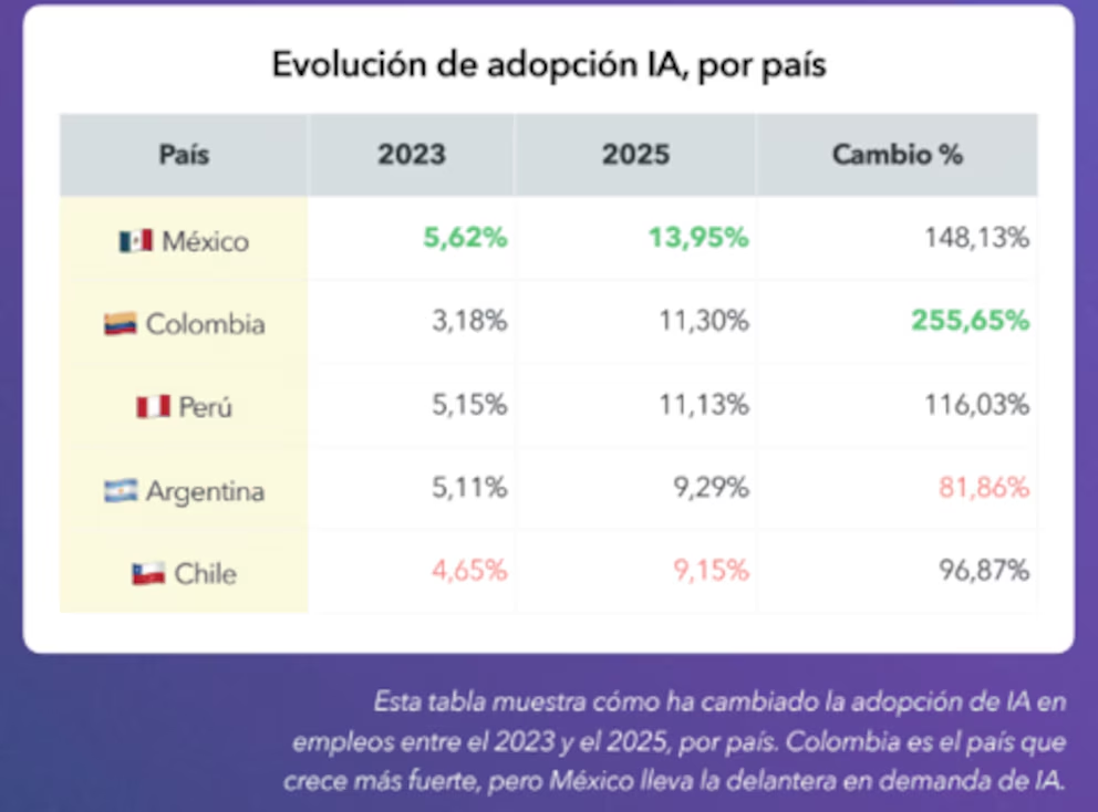 El estudio señaló que la adopción de IA en empleos tecnológicos alcanzó un promedio regional del 11% en 2025, con un crecimiento del 57% respecto del año anterior. La expansión fue más notoria en áreas no técnicas, donde los anuncios laborales comenzaron a exigir habilidades vinculadas con la automatización, los agentes de IA y el uso de modelos de lenguaje (LLMs).