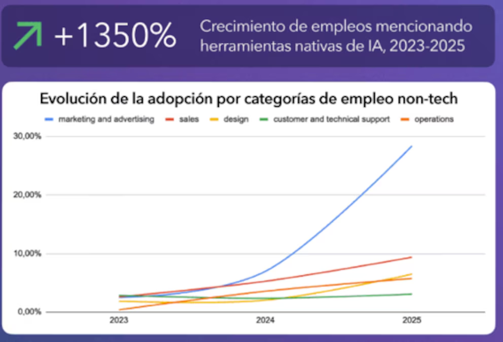 La expansión de estos roles hiper-especializados respondió a un fenómeno que Macarena Larraín, Head of Product de Get on Board, definió como “transformación acelerada de las funciones”. En sus palabras: “Los anuncios de empleo que piden manejo de herramientas IA están creciendo fuerte también en roles operativos no técnicos como ventas, marketing o soporte. Prototipar con Lovable, automatizar e integrar con n8n o Make, usar LLMs, generadores de imágenes o note takers ya no es opcional: son exigencias del presente, y la tendencia indica que seguirán en alza”.