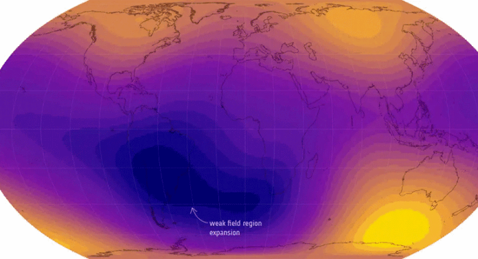 Imágenes satelitales revelan que una enorme anomalía en el campo magnético terrestre continúa expandiéndose, según un estudio publicado recientemente en la revista Physics of the Earth and Planetary Interiors.